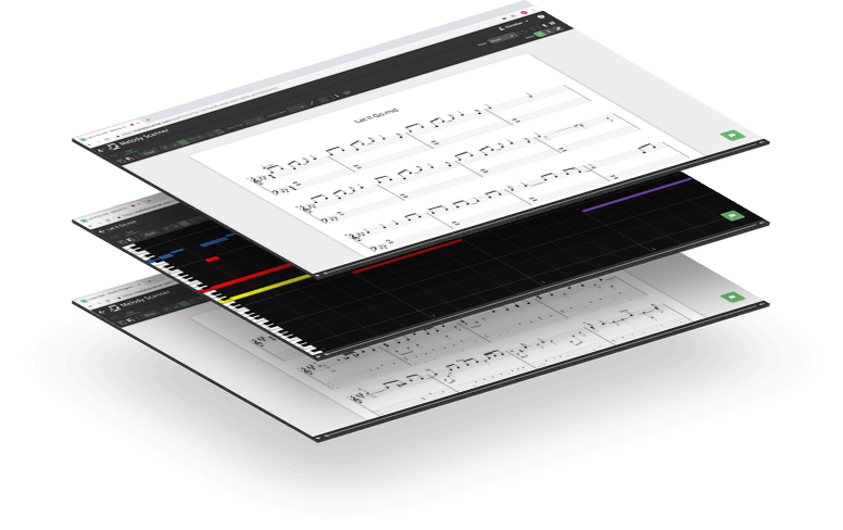 採譜した音符を再生、編集し、楽譜、MIDI、MusicXML、GuitarProとしてダウンロードできます。